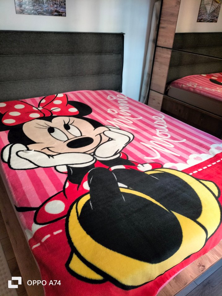 Renkli baskılı Minnie Mouse desenli, yumuşak ve sıcak hissettiren polar kumaştan yapılmış çocuk battaniyesi. tek kişilik