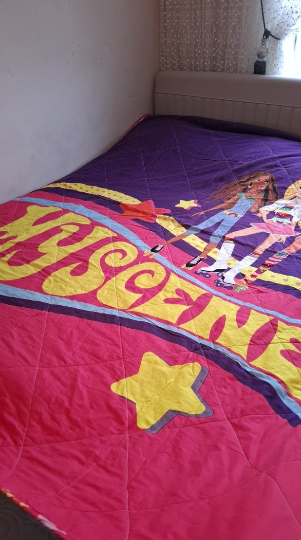Yumuşak sentetik kumaştan, mor zemin üzerine renkli baskılı çocuk pidesi örtüsü Çocuk odaları için uygun. ️