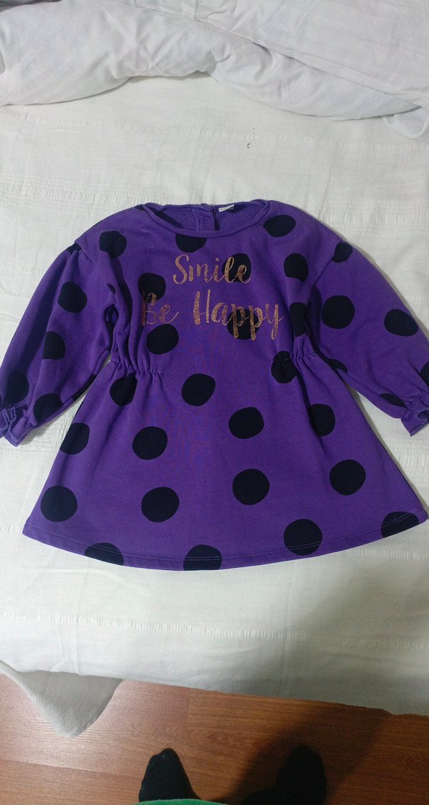 Rahat kesim, uzun kollu, yuvarlak yaka kız çocuk elbisesi. Yumuşak ve sıcak kumaş, renkli büyük puantiyeler ve önünde "Smile Be Happy" yazısı ile dikkat çeker.