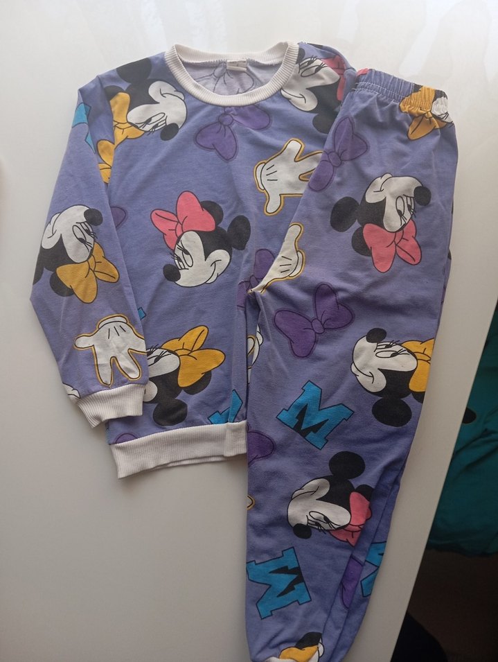 Renkli baskılı, mor kız eşofman takımı; bol kesim, uzun kollu, yuvarlak yakalı ve yumuşak örme kumaştan üretilmiştir. 3/4 yaş hafif renk solması mevcut