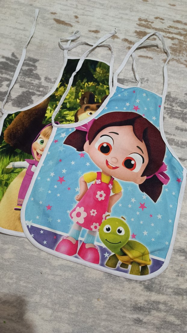 Neşeli çizgi film kız ve kaplumbağa baskılı, renkli mutfak önlüğü, yemek yaparken keyif katar.