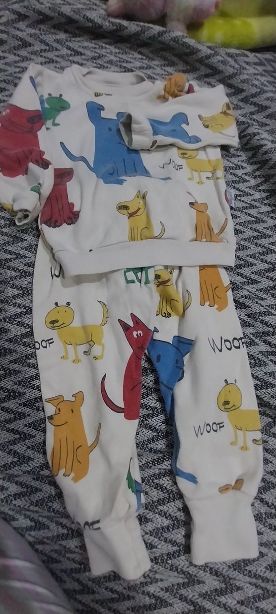 Renkli , baskılı köpek figürleri ve "WOOF" yazılı, sokak tarzı köpek kıyafeti. pijama takımı