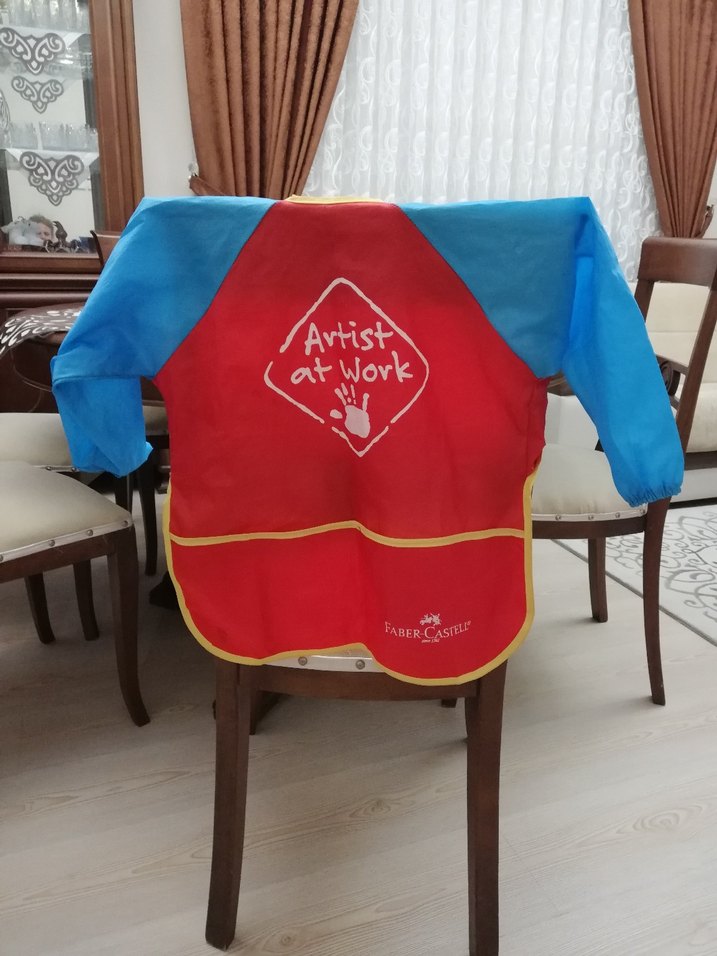 Uzun kollu, renkli baskılı oyun önlüğü, 'Artist at Work' yazısı ve kırmızı-mavi renkleriyle dikkat çeker.