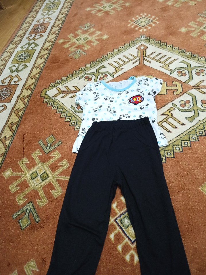 2'li Çocuk takım alt üst parça, yüzde 40 pamuk, yüzde 60 polyester, herhangi bir defosu yoktur, etiketli üründür. baskılı ve turkuaz beyazdır. 4 yaş bedeninde 104 cm'dir.