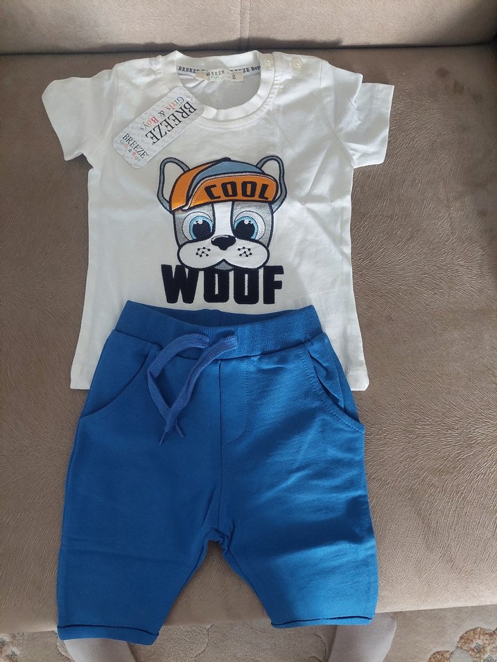 Beyaz renkli, kısa kollu pamuklu üstte renkli köpek baskısı ve "WOOF" yazısı bulunur. Cepli, bağcıklı mavi örme şort ile tamamlanır. Hiç kulanılmamış. Etiketteki bedeni 80 sm geçiyor