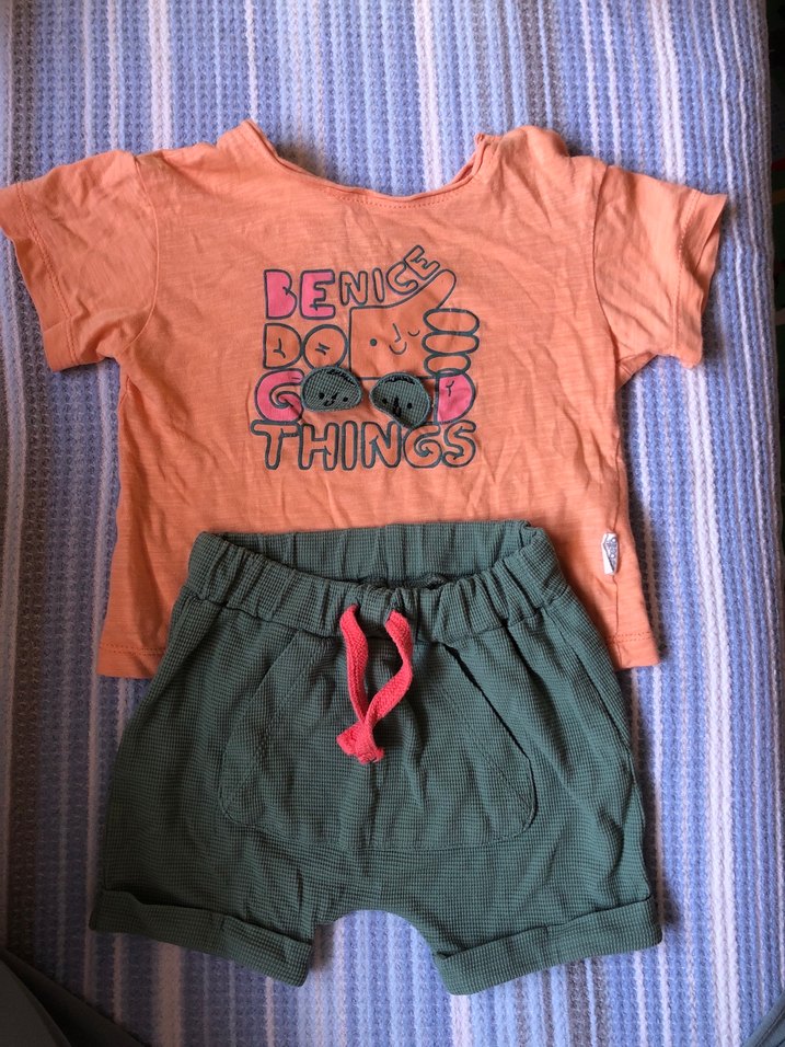 Kısa kollu, baskılı pamuklu tişört ve belden bağcıklı yeşil şorttan oluşan rahat ve şık bebek takımı. Unisex. Hiçbir sorunu yok çok az kullanıldı tertemiz