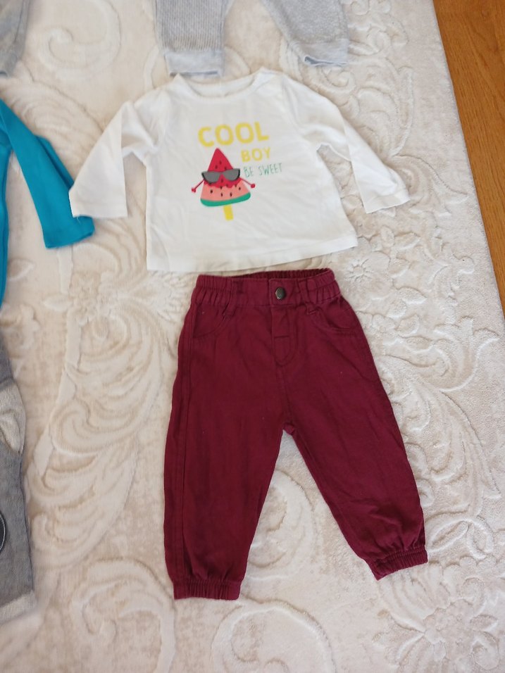 Pamuklu, uzun kollu, renkli baskılı beyaz tişört ve bordo pantolon içeren bebek takımı. Tişört üzerinde 'COOL' yazısı bulunur, rahat ve şık bir sokak tarzı sunar.