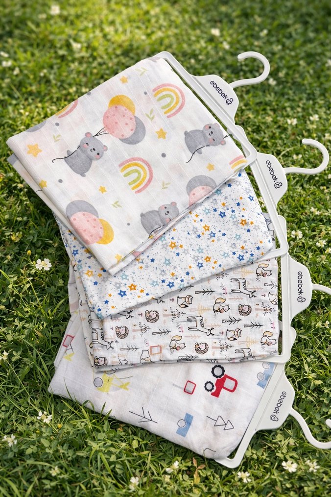 Çeşitli baskılı desenlere sahip renkli pamuklu çocuk battaniyeleri, yumuşak ve nefes alabilir yapıda. e bebek