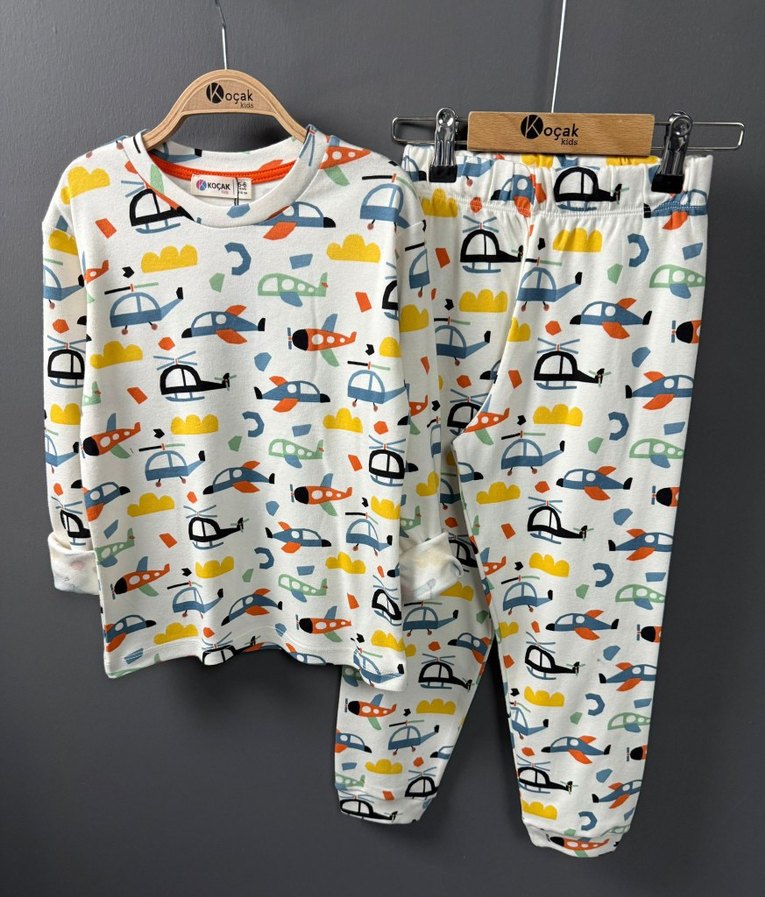 Yumuşak pamuklu kumaştan yapılmış, renkli helikopter ve uçak baskılı çocuk pijama takımıdır. ✈️