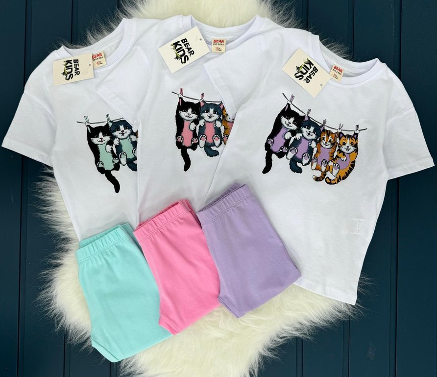 Pastel renklerde baskılı üstlere sahip, pamuklu ve yumuşak kumaştan yapılmış çocuk pijama takımları. Altlar pembe, mor ve mint renklerinde. yaşları 4,9 ardında değişiyor yaş sorunuz