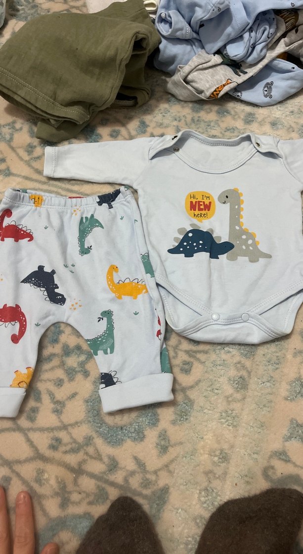 Renkli baskılı, pamuklu ve örme kumaştan uzun kollu erkek bebek takımı. Dinozor desenli, yuvarlak yaka ve rahat kesim özelliklerine sahiptir.