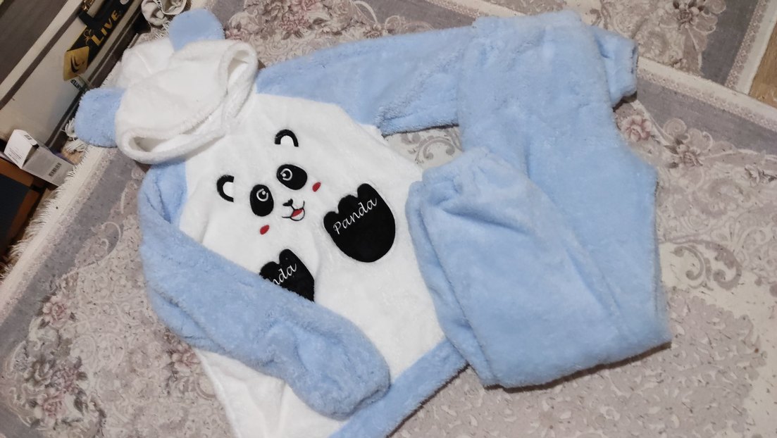 Renkli baskılı panda deseni ve mavi kollarıyla yumuşak, sıcak kumaştan çocuk pijama takımı.