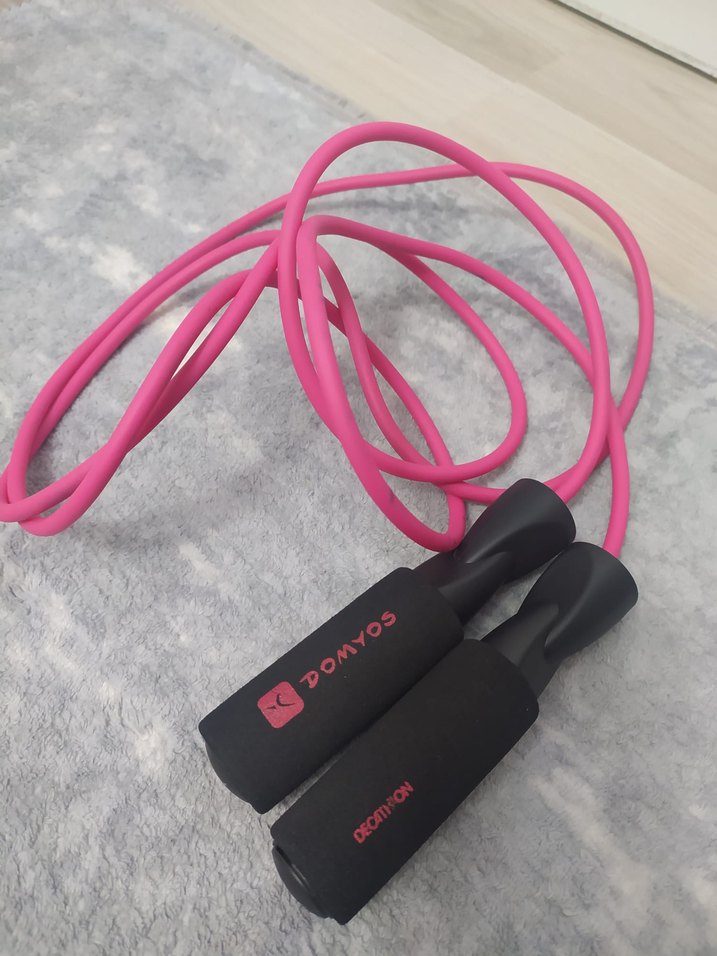 Renkli baskılı pembe atlama ipi, Domyos logosu ve siyah rahat tutacaklara sahiptir. Fitness için uygundur. ♀️