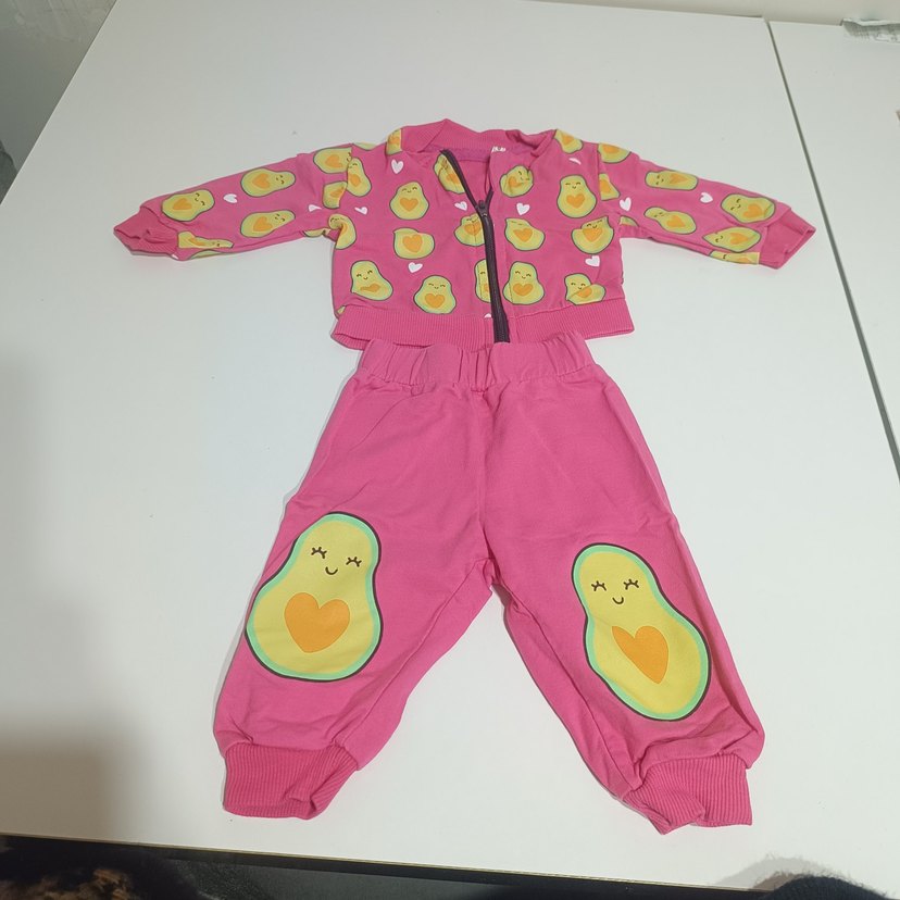 Renkli baskılı, uzun kollu ve fermuarlı üst ile pembe bebek kız takımı. Pantolonlarda sevimli avokado baskıları bulunur.
