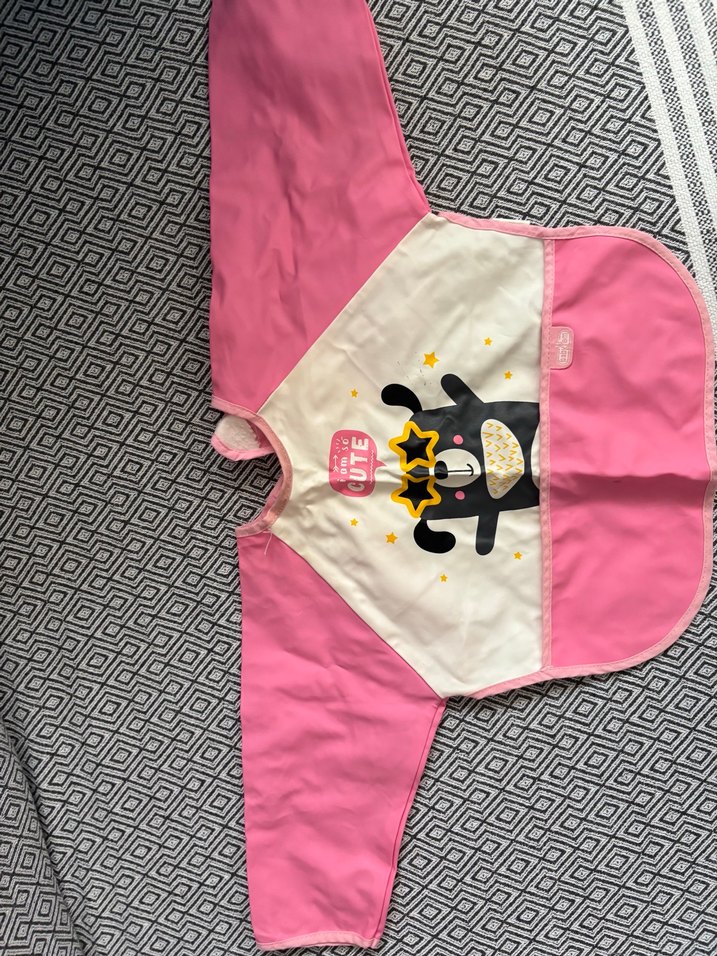 Uzun kollu ve baskılı sevimli karakterli, yıldız gözlü renkli pembe bebek önlüğü. Ön ve arka kısmı su geçirmez.