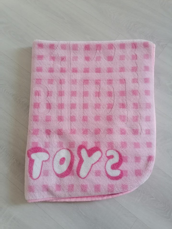Yumuşak ve sıcak kumaştan yapılmış, renkli baskılı pembe çocuk battaniyesi, kareli desen ve 'TOYS' yazısı ile.