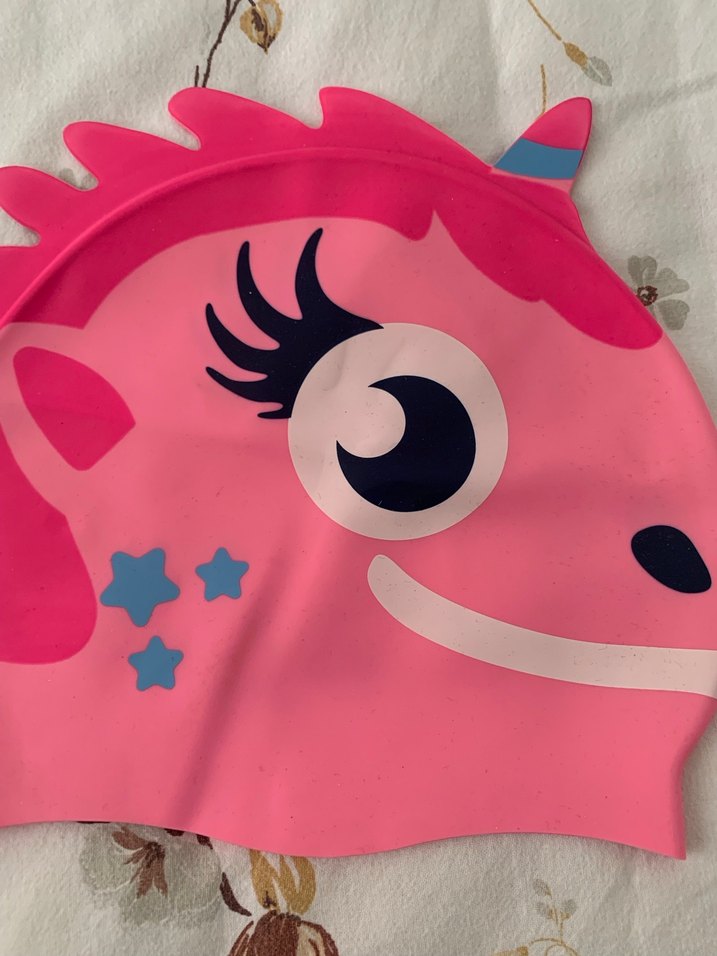 Sentetik kumaştan yapılmış, renkli baskılı pembe çocuk bone