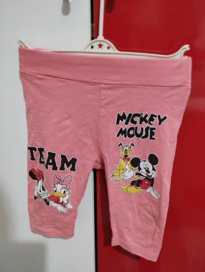 Yumuşak sentetik kumaştan yapılmış, Mickey Mouse ve arkadaşlarının renkli baskıları ile pembe çocuk taytı.