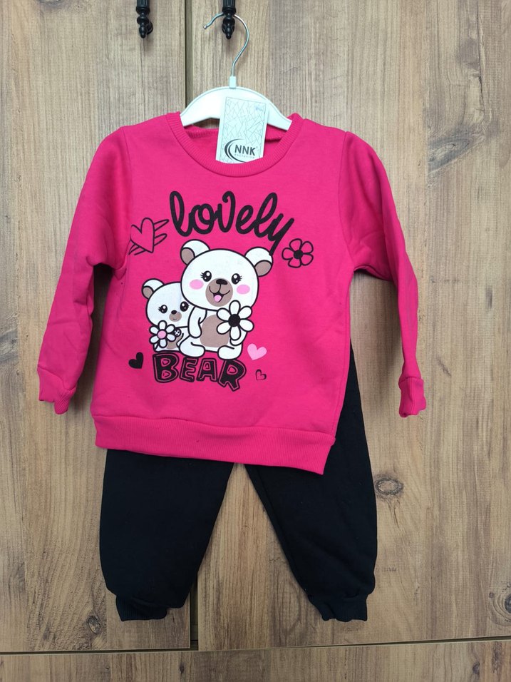 Uzun kollu pembe üstü renkli ayı baskılı, siyah triko pantolonlu kız bebek takımı.