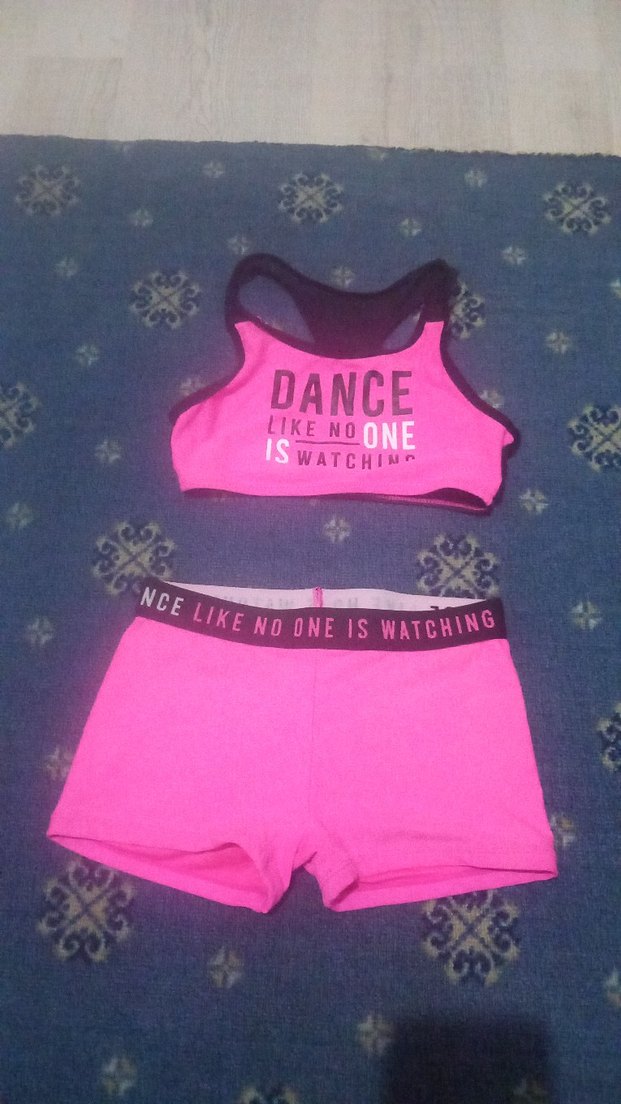 Renkli baskılı pembe kız çocuk atlet ve şort takımı. Atlet üzerinde "DANCE LIKE NO ONE IS WATCHING" yazısı yer alır. Şortta uyumlu yazılı bel lastiği bulunur.