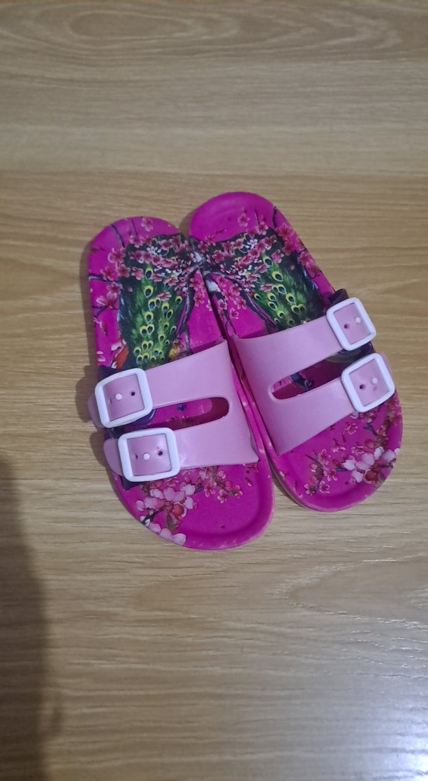 Ayarlanabilir tokalı kayışlara sahip, kauçuk malzemeden renkli baskılı pembe kız terliği.