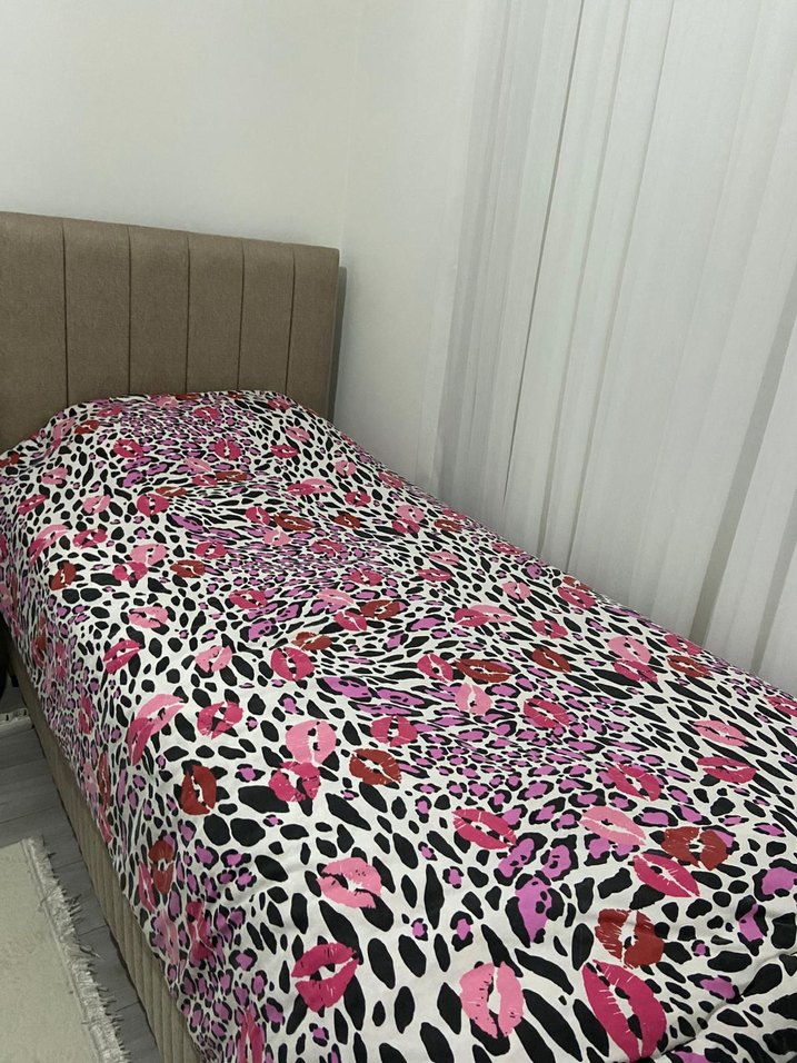 Renkli baskılı desene sahip, pembe ve siyah tonlarında canlı bir görünüme sahip nevresim. ️ eni 145boyu190