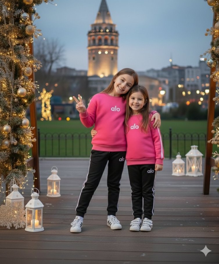 Renkli Baskılı Pembe Sweatshirt ve Siyah Eşofman
