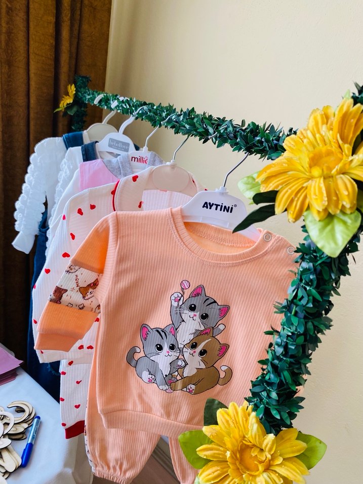 Renkli pembe, uzun kollu, baskılı kedi deseniyle örme bebek kıyafet takımı. AYTİNİ markasına ait.