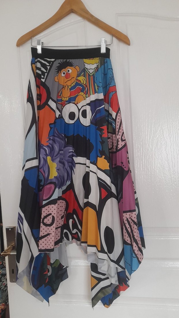 Renkli baskılı, bol kesim ve pilili detaylara sahip uzun etek, avant-garde ve trend partiler için uygun.