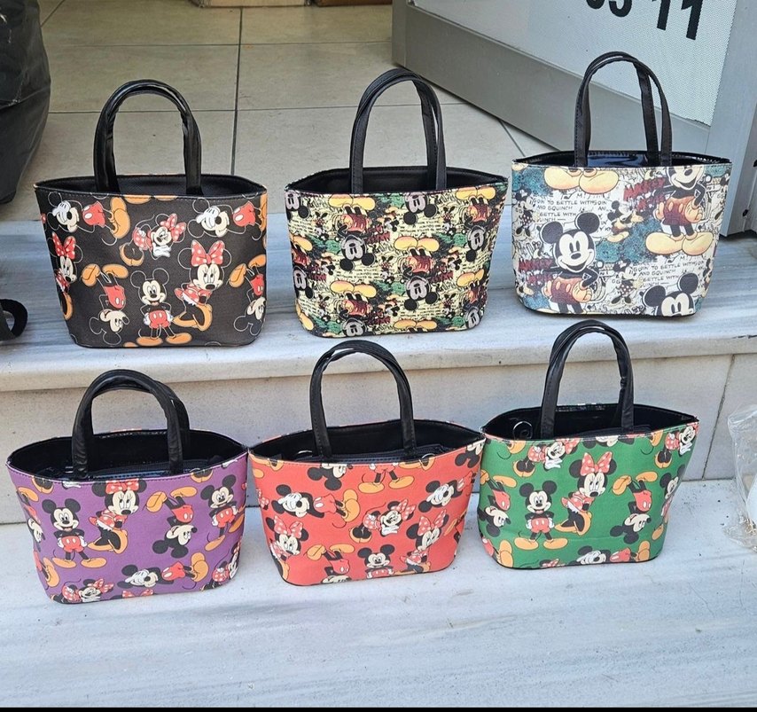 Renkli baskılı pop kültür figürlü plastik kadın çantası, siyah saplı, günlük kullanıma uygun.