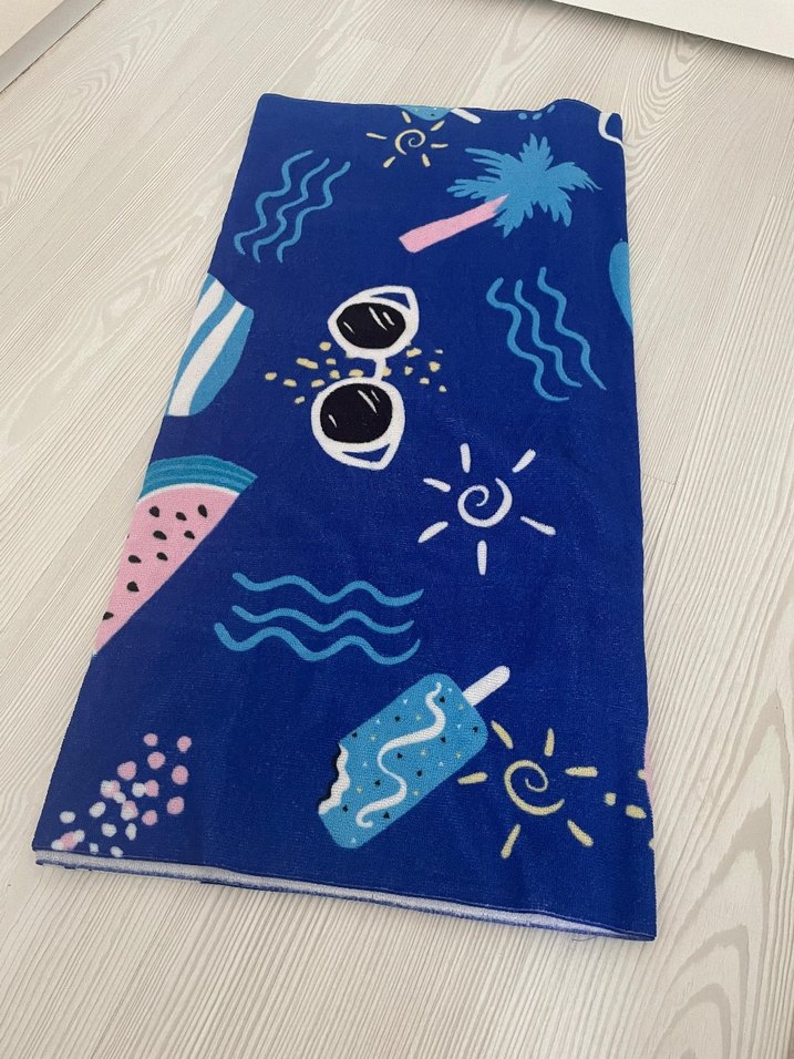 Mavi zemin üzerinde güneş gözlüğü, palmiye ağacı ve dondurma desenleri bulunan renkli pop kültür baskılı plaj havlusu. Migrostan almıştım bir kaç kez kullanıldı.