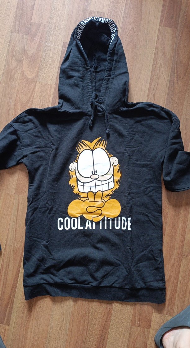 Renkli baskılı, puflu tasarıma sahip kapüşonlu sweatshirt. Üzerinde "COOLATITUDE" yazılı eğlenceli kedi deseni bulunur. Sokak stili, gri renk.
