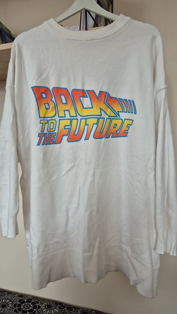 Bu beyaz sweatshirt, renkli 'Back to the Future' baskısı, uzun kollu ve rahat kesimiyle sentetik kumaştan üretilmiştir. Düğme detayları ve yuvarlak yaka içerir, günlük sokak stiline uygundur.
