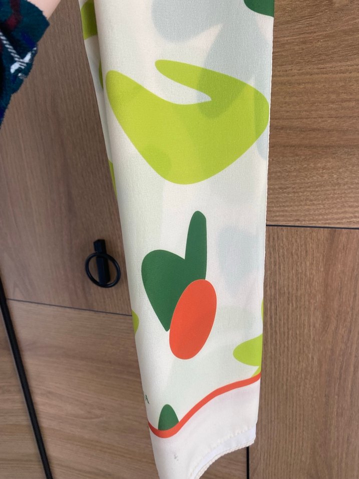 Hafif renkli ve yeşil ile turuncu şekillerin yer aldığı baskılı desene sahip şal