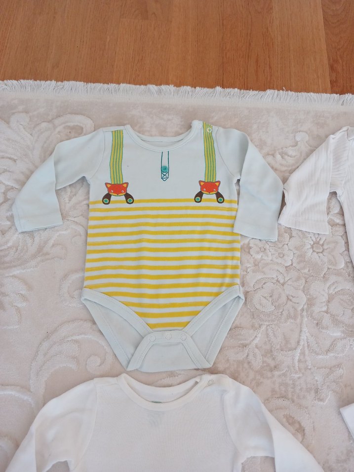 Uzun kollu, bisiklet yaka bebek body, renkli baskılı askı ve sarı çizgiler içerir. Yumuşak örme kumaştan, çıtçıtlı kapanışlı.