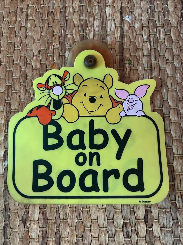 Sarı renkte, Winnie the Pooh karakterlerinin renkli baskıları ve 'Baby on Board' yazısı bulunan, vantuzlu bebek işareti.
