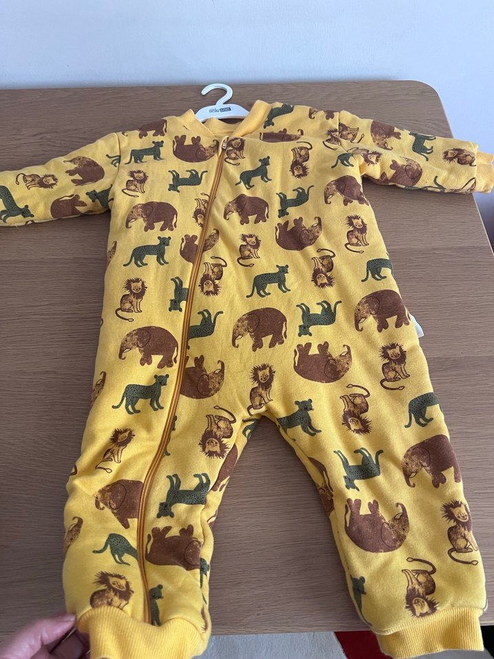 Renkli hayvan baskılı, fermuarlı, uzun kollu ve bisiklet yaka sarı bebek tulumu, yumuşak ve sıcak kumaştan üretilmiştir.