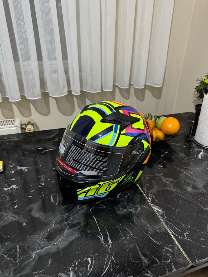 Cesur tarzda, sarı renkli ve renkli baskılı biker motosiklet kaskı. Konfor için velcro bant ve yumuşak kürk iç yüzeye sahiptir. ️
