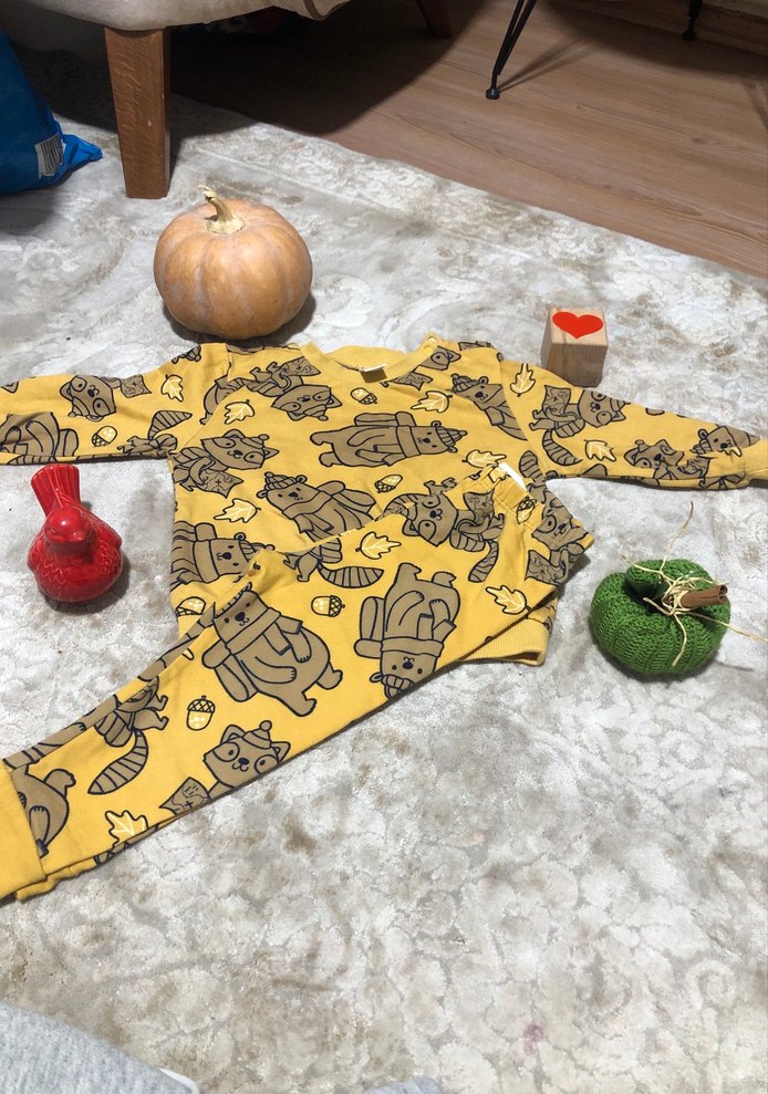 Renkli baskılı, sarı renkli triko kumaştan çocuk pijama takımıdır. Rahat ve sıcak uyku için uygundur.