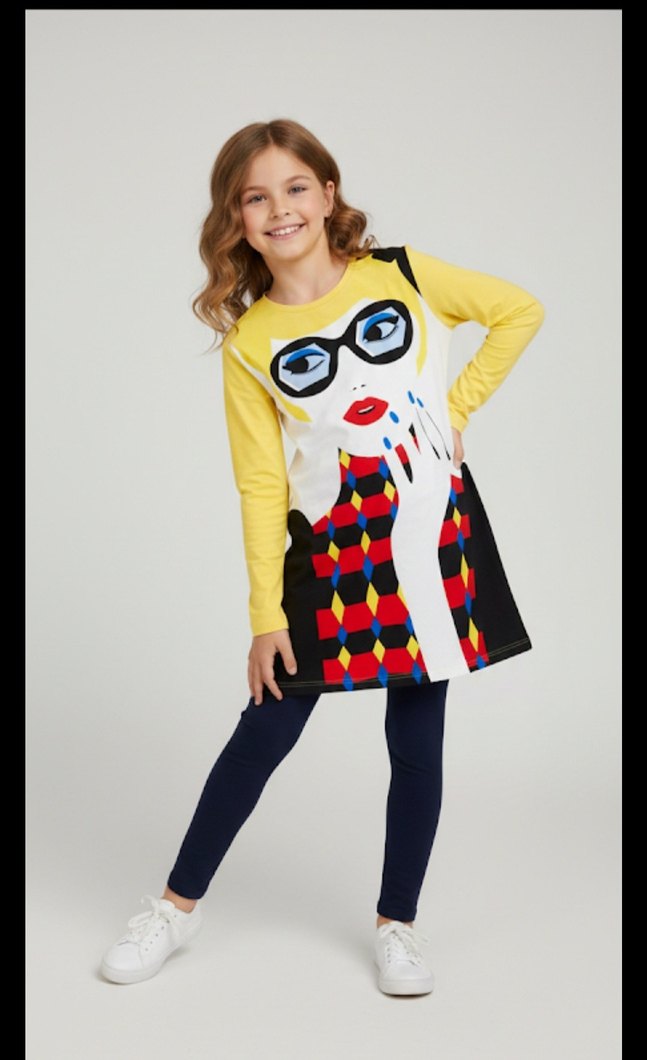 Rahat kesim, uzun kollu, yumuşak örgü kumaştan yapılmış, renkli baskılı ve canlı sarı renkte kız elbisesi.
