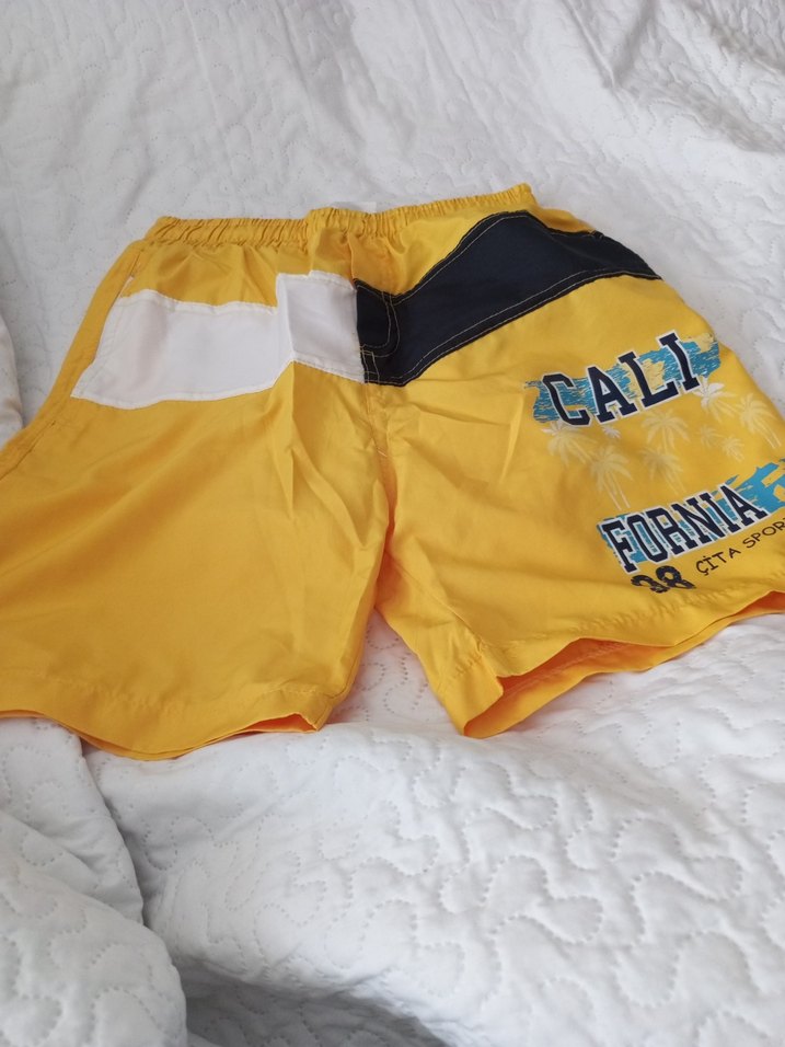 Renkli baskılı, düğmeli , bol kesim sarı mini erkek şort. Plaj ve günlük sokak stiline uygundur.