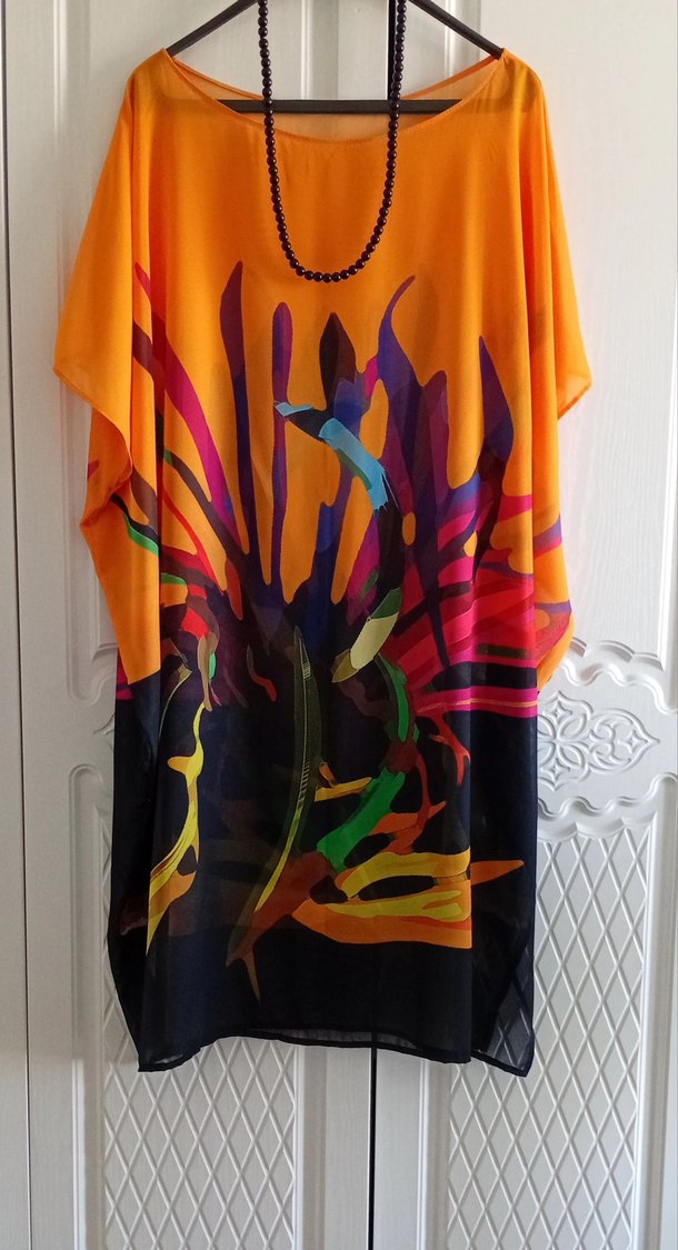 Renkli baskılı 46 48 50 bedene kadar uygun uzun bohem kadın pareo, düşük kollu yanda yırtmaçlı aşagı doğru daralan bol kesimdir....Firmanın özel modelidir..içi temiz dikiş çalışılmış beden 80 cm rahat salaş boy omuzdan 110cm