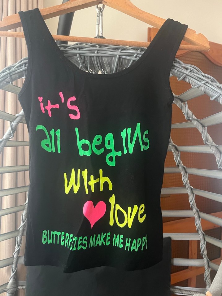 Renkli baskılı siyah atlet, askısız ve vücuda oturan kesime sahip. Normal uzunlukta, bohem ve retro tarzında, günlük kullanıma uygun. Sevgi ve mutluluk mesajı içerir.