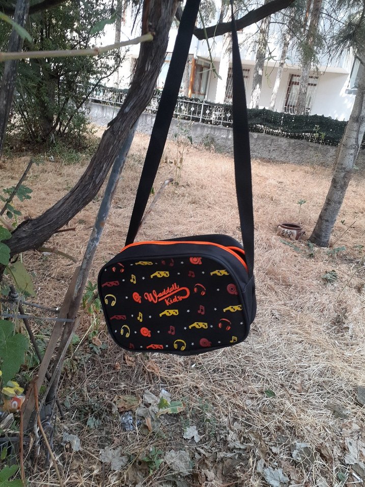 Siyah renkte, renkli baskılı ve Sentetik kumaştan, çocuk beslenme çantası marka temsilidir.