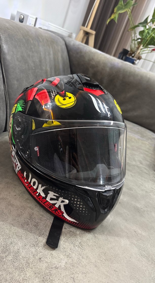 Renkli baskılı desenlere sahip siyah biker kask, tokalı kayışlı ve "JOKER" yazılı. Plastik malzemeden, şeffaf vizörlü. ️