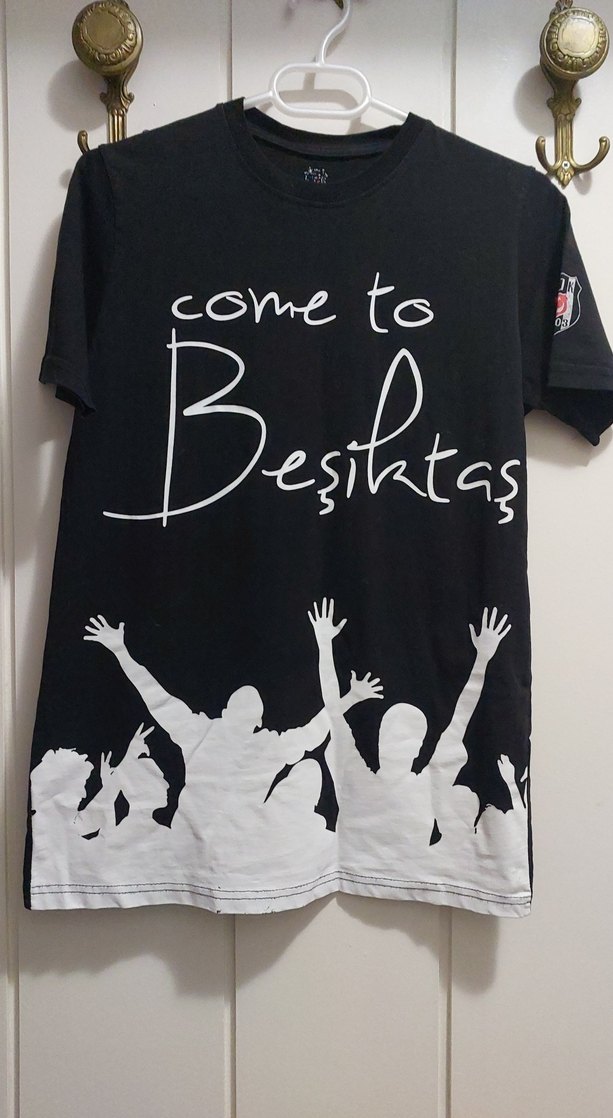 Pamuklu, kısa kollu ve bisiklet yakalı siyah hamile tişörtü, renkli baskılı ve kadife bantlıdır. 'come to Beşiktaş' yazısı ve kalabalık figürüyle parti havası sunar.