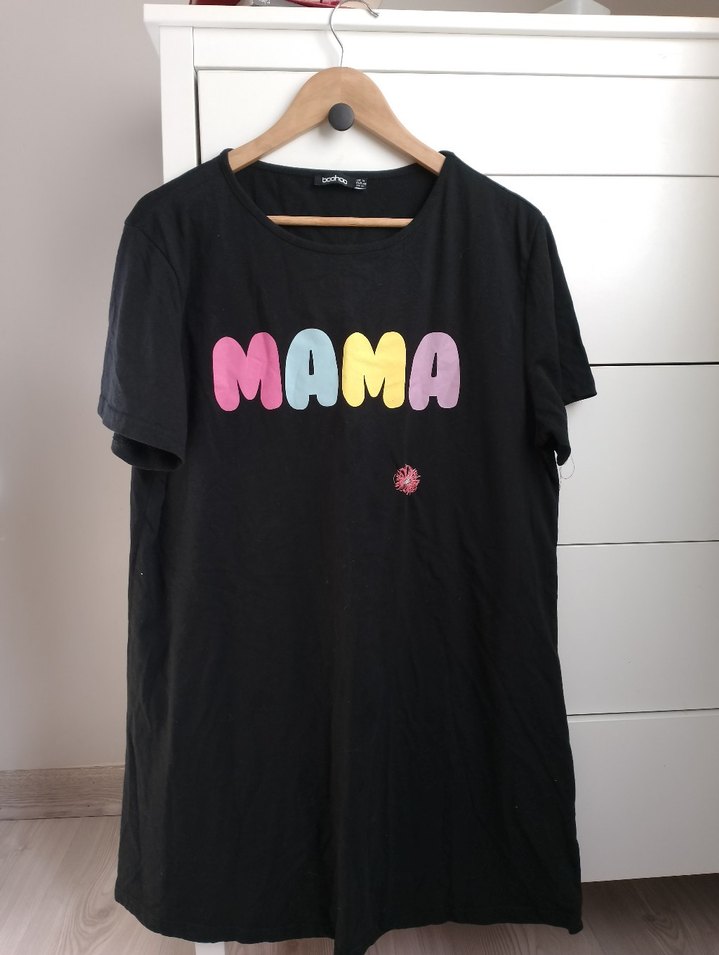 Siyah hamile tişörtü, pamuk kumaştan, kısa kollu ve yuvarlak yakalıdır. Önünde pastel renkli "MAMA" baskısı bulunur, rahat ve günlük kullanıma uygundur.