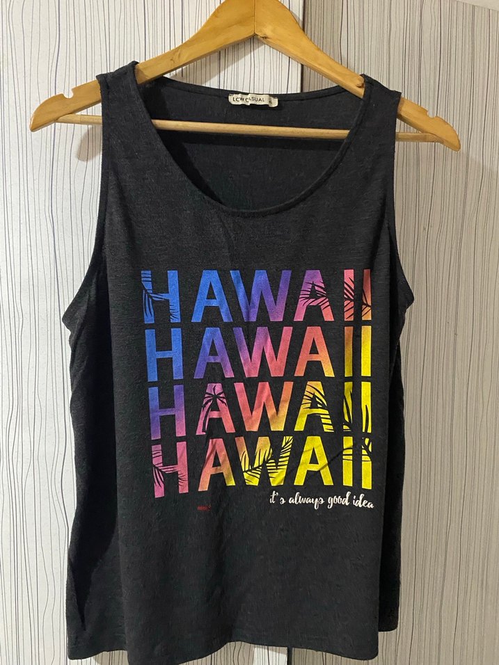 Siyah, yüksek yakalı, bol kesim kadın atlet. Önünde renkli 'HAWAII' baskısı bulunur. Yumuşak sentetik kumaştan, günlük rahat kullanım için uygun.