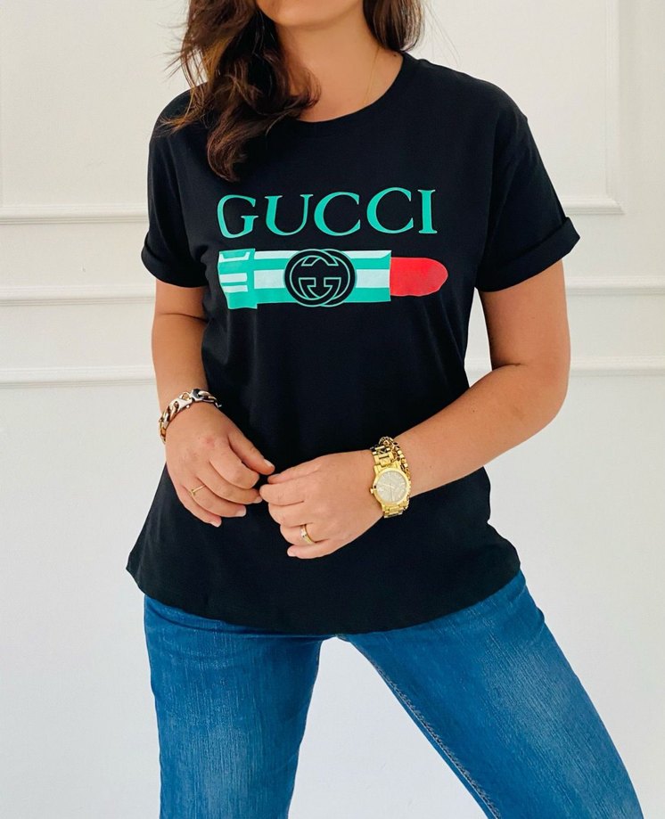 Pamuklu siyah tişört, renkli 'GUCCI' baskı detay içerir. Yuvarlak yaka, kısa kollu, tam kalıptır S M L bedenleri mevcuttur Kumaş kalitesi oldukça iyidir fiyat performans ürünüdür Renk solma olmaz