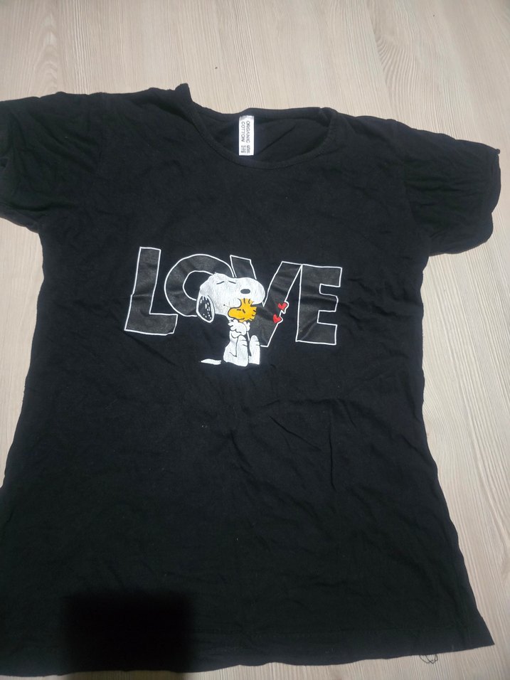 Siyah pamuklu tişört, renkli baskılı karakter ve "LOVE" yazısı ile. Kısa kollu, yuvarlak yaka ve bol kesimdir.